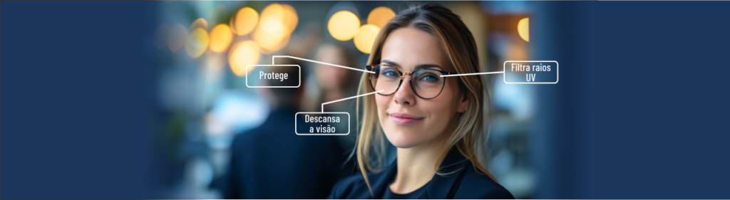Lentes que filtram a luz azul emitida por telas digitais, reduzindo a fadiga ocular e protegendo a visão durante o uso prolongado de dispositivos eletrônicos.